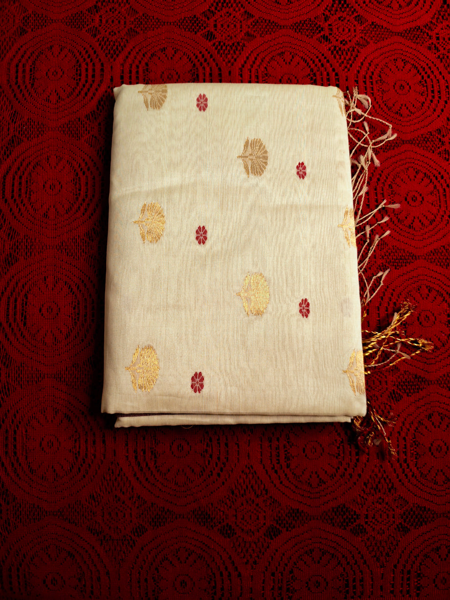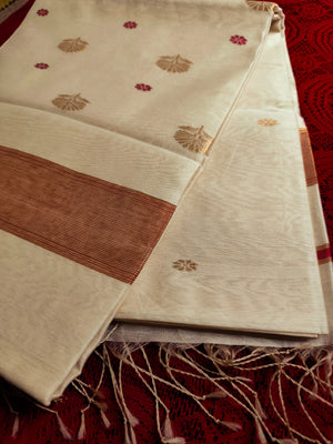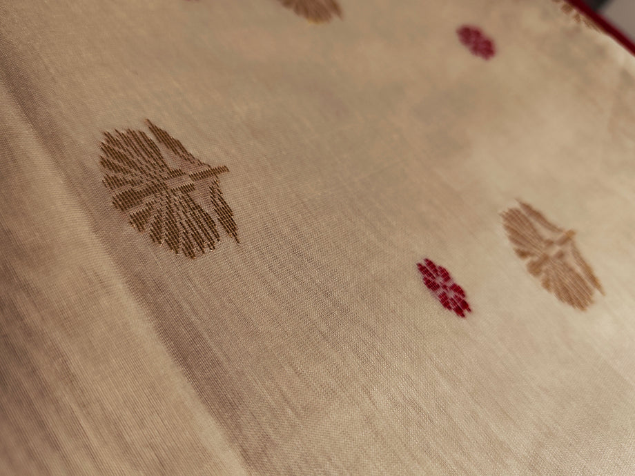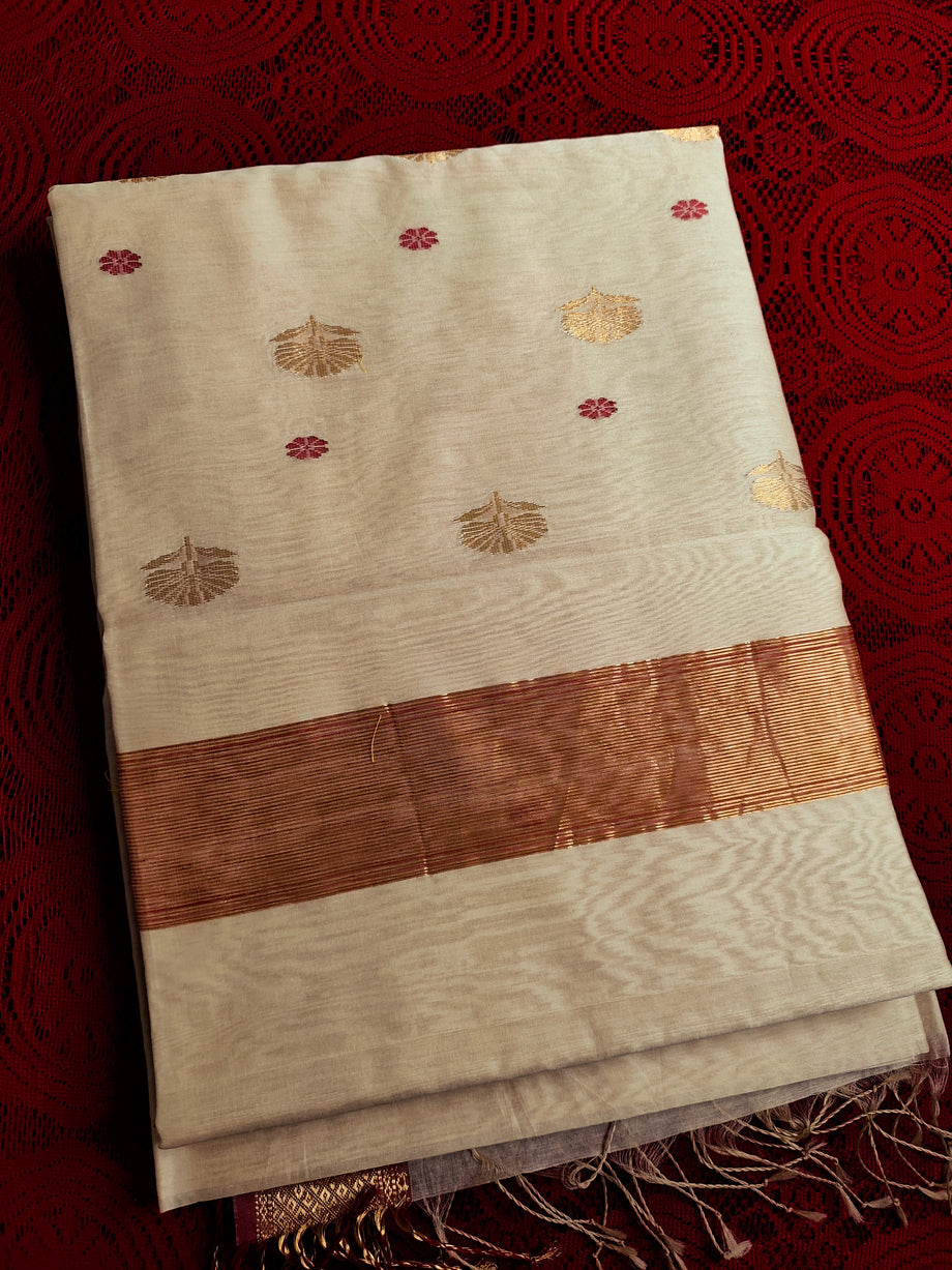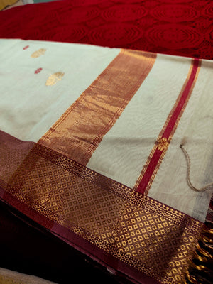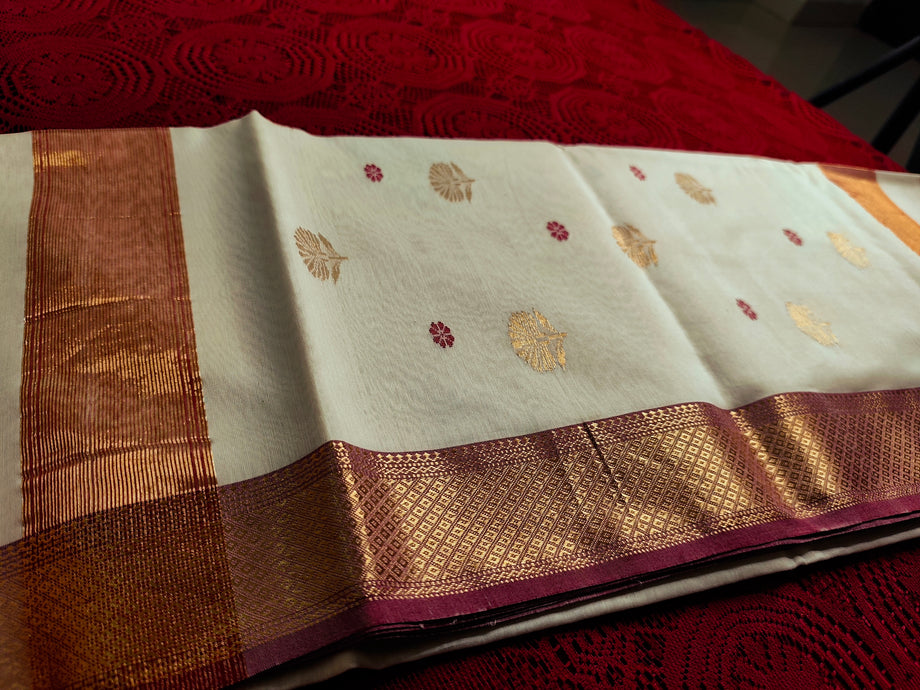 handwoven ivory & mahroon Maheshwari saree with golden zari border